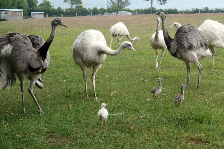 | 11th: The grass in the bottom three acre is very long and for ages we have wanted to put the sheep and alpacas in there to graze it. Today we therefore decided to move Alpha, Beta and the chicks back in with the other rhea (in the top 2-acre) and thus free up the 3-acre grass for the 4 leggeds. It also meant we woudln't have the worry of long wet grass being too much for the chicks. Well, the sheep and alpacas were thrilled with this as you can imagine and we were similarly thrilled when the meet and greet with all the adult rhea and the chicks, seemed to go well. A couple of hour after these photos were taken however, and as the heavens emptied once again, we found a different picture: three, wet, cold chicks and a wandering Beta who seemed to have fogotten how to be a dad... |