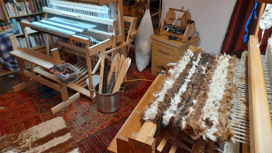 28th: Jacob x Blue Faced Leicester Just adore how this Jacob x Blue Faced Leicester rug is starting to build - we washed the fleece and loosely picked it before spinning but wanted very much to have as many of the curls visible as we could. It's definitely giving us the effect we wanted, so far!! We have Exmoor Horn x Blue Faced Leicester to add to the mix as well!! Cannot wait to see how that will look. ![]() |