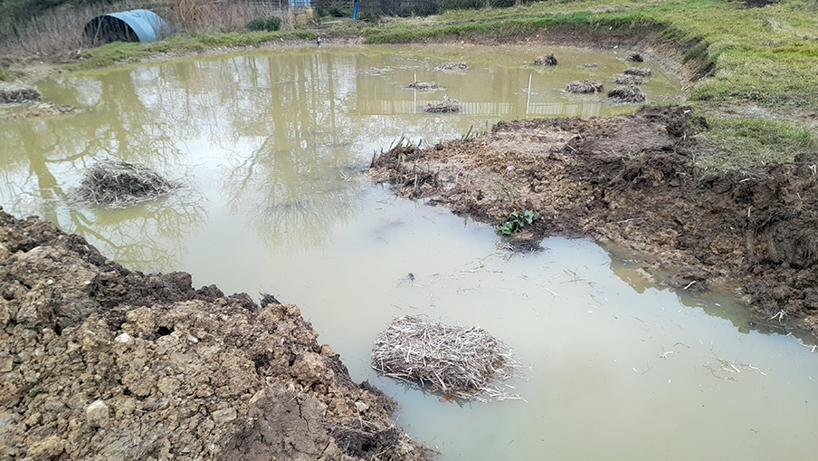 15th: The ponds week three/four We have had quite an interesting lot of weather since the ponds were first started just under four weeks ago: very heavy rain, winds, frosts, sun and drizzle. Both Yellowhammer and Wagtail ponds have been virtually full but both then dropped (evaporation plus in Wagtail's case a slight leak at the back). Ponds seven and eight have barely begun to fill with water. Our stream stopped flowing after a week or so but today vaguely began again. We are loving see birds enjoying the banks and the turned over soil. John's pond is now over four months old and the grass is now creeping down into the banks. What will it all look like in another four months?? John's and Stonechat