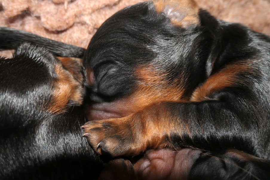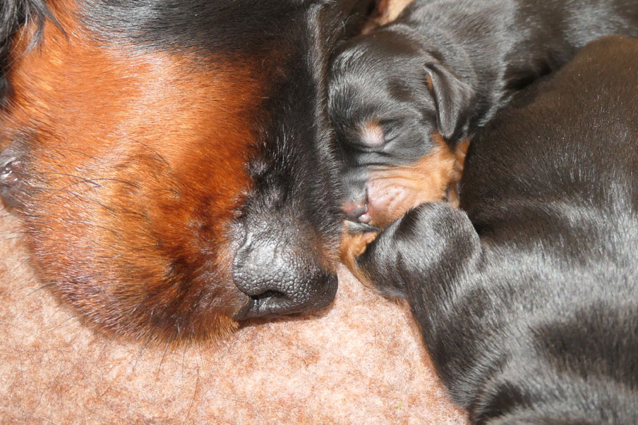 It all kicked off around 1.30 this afternoon when after a morning of increasing panting, restlessness and total lack of interest in food, Roxy shunned the whelping box, broke her waters on the sofa in the study and then gave birth to puppy number one on the settee in the front room. At least that was the right room!! We got her and pup moved as required and thus began a fairly regular popping out of black and tan bundles, one or two every hour. By just before 6pm we were up to eight pups: six boys and two girls and Roxy was definitely looking a tad haggard! We were fairly sure there were more to come but were then horribly shocked when around 7.15pm a dead boy appeared - he was perfect in every way but quite dead. Roxy licked him for a while but we removed him without any fuss so she could concentrate on the eight live ones, all busy looking for milk and telling whoever was prepared to listen, quite what they thought at having to share the milk bar!! Roxy began to snooze and we wondered if there were any more - we were a wee bit concerned at what having a dead pup might mean for any still yet to be born. We spoke to Gloria and to our vet and felt reassured that if Roxy was relaxed, the pups were feeding (albeit with accompanying squeals) and nothing 'appeared' to be wrong, then probably all was well and that a litter of nine might well be it!! We had supper and a cuppa and slightly started to relax!!! Around eleven-ish Jack wondered about joining David in bed and the joys of sleeping on a proper mattress. Roxy however had other ideas! At around 11.15pm, almost FOUR hours since the last pup was born, out popped a third girl, quickly followed by a seventh boy, and even more quickly followed by a slight welling up of tears as Jack rushed upstairs to wake up David with the news. Flip!!! Roxy has done it again - given us ten pups!!! We are in awe!!! ![]() ![]() ![]() ![]() ![]() ![]() ![]() ![]() ![]() ![]() ![]() |