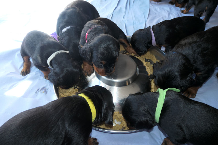| Twenty-two days old: Tuesday 5th July Sleep, wee, poo, eat, quick wander.. and repeat With milk and solid food filling their bellies (although still a lot more milk than biscuits), the pups now seem to be poo-ing and wee-ing at a greatly increased rate (or are we just seeing it more? LOL). Roxy is still winning the 'I can feed them better than you' competition but as one of the photos shows, we are making progress with our part - at one time we had SIX pups feeding at once today - what a result!!